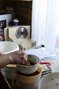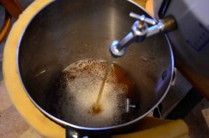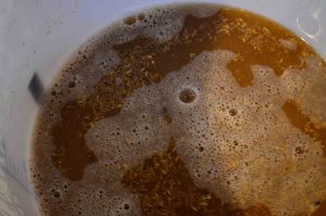 Das 1. Mal Maische „Läutern“ war eine Qual. Der eigentliche umgebaute Kübel mit Läutersieb funktionierte nicht, so musste kurzerhand ein Nudelsieb her mit anschließender Filtration durch ein Geschirrtuch.